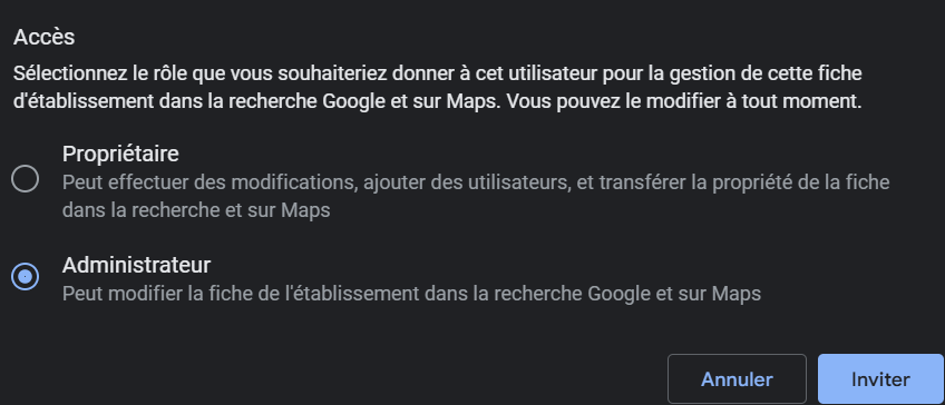 Google détaille les étapes dans son aide en ligne : “Gérer les propriétaires et les administrateurs de votre fiche d’établissement